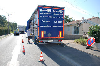 Premiere camion de livraison arrive. C´est un Megatrailer et n´arrive pas rentrer jusq´au terrain. Nous sommes donc obliger de decharger sur la route. J´avais anticipé et demander autorisation de la Mairie pour decharger sur la route.